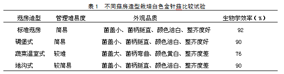 从试验结果可以看出,各种式样的菇房在栽培白色金针菇时,标准菇房的管理最简易外观品质最好,生物学效率最高,但这种菇房造价较高,适合有实力的企业进行工厂化周年生产,在太行山区现阶段推广有一定难度;其次是碉堡式菇房和地沟式菇房,但试验中发现地沟式菇房栽培的金针菇因为通风效果不好容易形成水菇(菌盖因为水分过大呈半透明状,这种菇极不耐储存),而碉堡式菇房能很好的解决这一问题,但第一年新建碉堡式菇房也容易造成水菇情况,原因新建菇房土中含水量过高,大量蒸发出水分到菇房所致,因此要求新建菇房是要早些时间建设,在使用前使构建菇房的土中的水份大量蒸发后使用;蔬菜温室式菇房因其保温保湿效果差造成各方面指标均不理想,这种菇房不适合用作金针菇栽培。